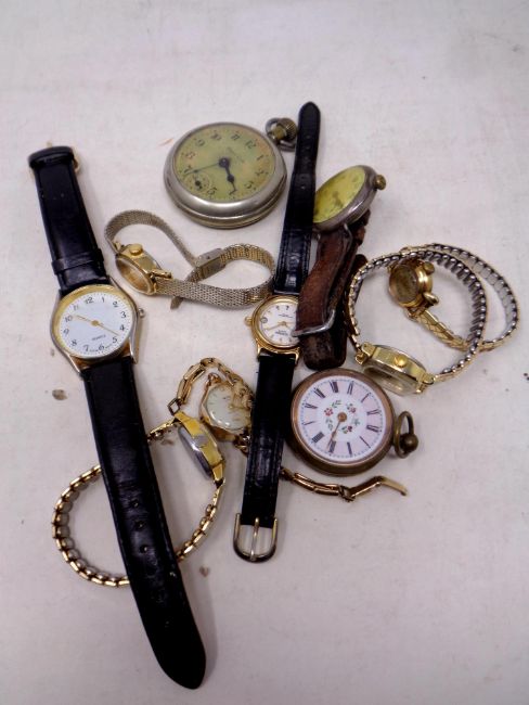 A box containing assorted watches to include a plated cased Peter Pan First World War era pocket watch, fob watch, lady's and gent's wristwatches