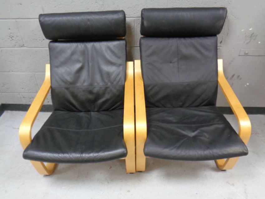 A pair of Ikea beech framed armchairs with black leather cushions