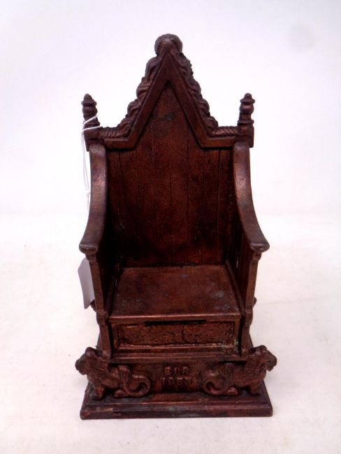 A 1953 Queen Elizabeth II Harper cast iron Coronation money box in the form of a throne