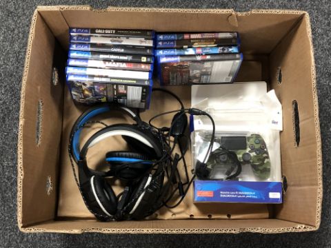A box containing eleven Play Station 4 games to include Marvel Lego, Call of Duty, Grand Theft Auto, Need for Speed etc, together with Play Station 4 accessories