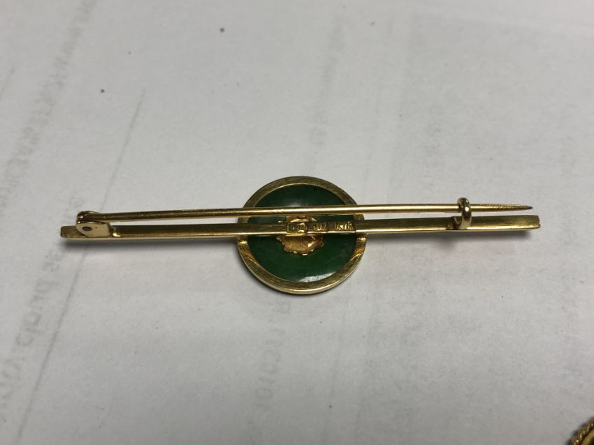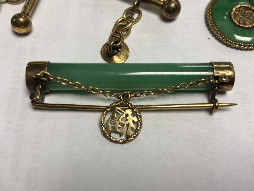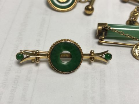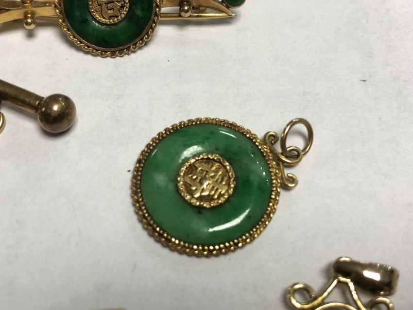 One brooch missing centre gold disc. One cufflink missing jade and gold disc head. Otherwise these seem to be in good condition.