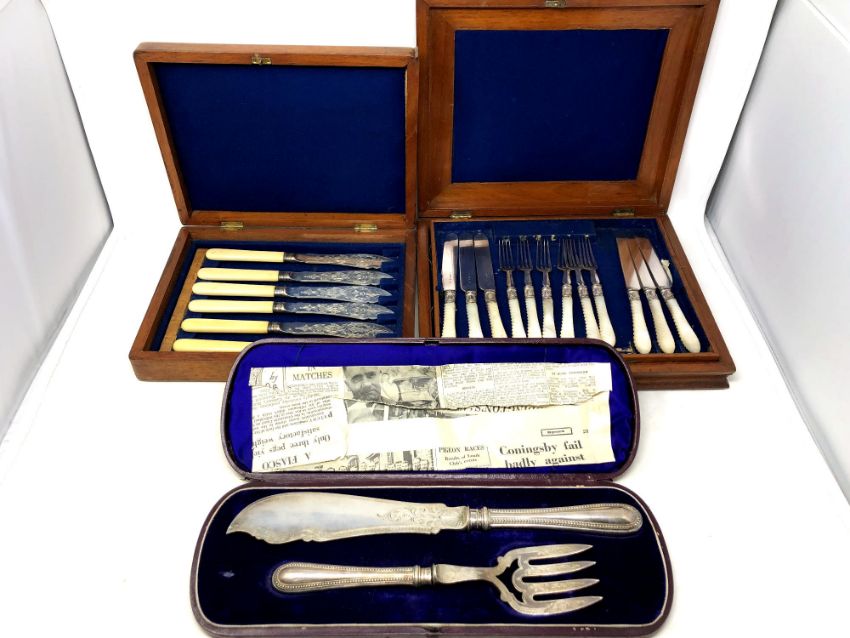 A mahogany canteen box containing a twelve piece place setting with mother of pearl handles, A1 silver plated marks, together with Victorian fish servers in case and part canteen of fish cutlery.