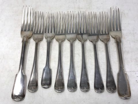 Six silver dessert forks, London 1919 (347.2g), together with a further silver fork and two table forks of similar design, gross 554.9g.