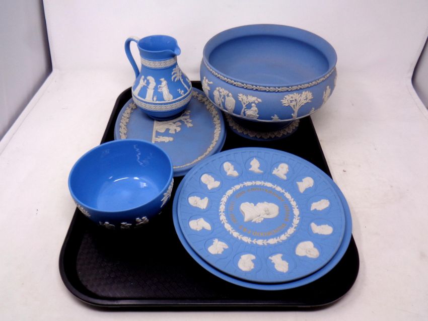 A tray containing six pieces of Wedgwood Jasperware to include anniversary plates, bowl, jug
