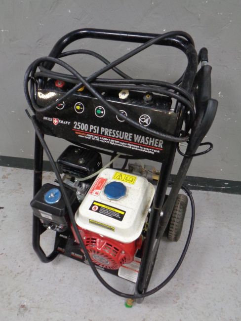 A Swiss Kraft 2500 PSI pressure washer on trolley