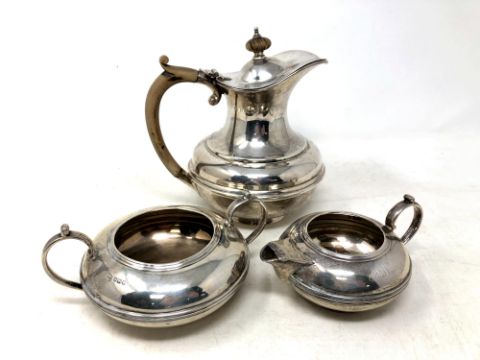 A silver three piece tea service (non matching), comprising of silver teapot, 481.5g, Birmingham 1919, S W Smith & Co, sugar basin and milk jug by Mappin & Webb, Sheffield, 357.8. Gross weight 839.3g.