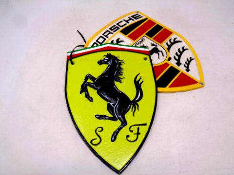 Two cast iron plaques, Porsche and Ferrari