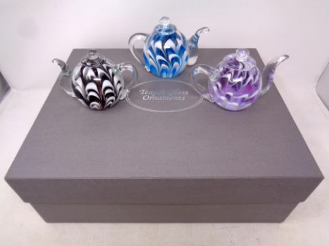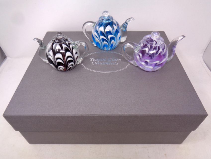Three glass teapot ornaments in original box