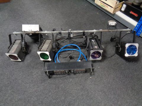A spotlight rig with four CCT Minuette FR spotlights together with a channel fuse box and a Logic 4004 light management system
