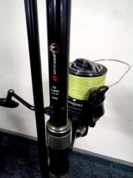 A Warrior two piece carp rod together with Shimano Aerlex XTB Spod reel