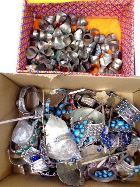 Two boxes containing a quantity of Asian white metal bracelets and rings