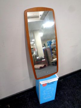 A mid 20th century frameless mirror mounted on a teak board together with a juice extractor, boxed