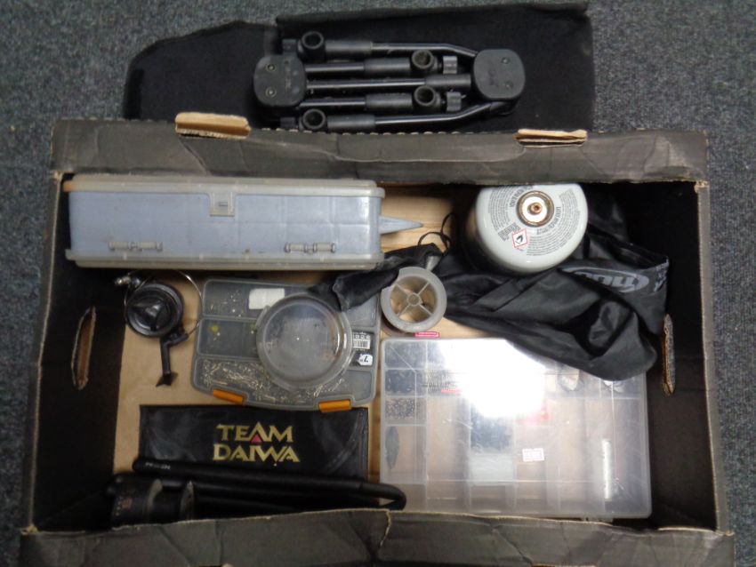 A box containing assorted fishing equipment to include a Fox black label edition rod stand in carry bag, reel wallets, plastic cases containing fishing accessories