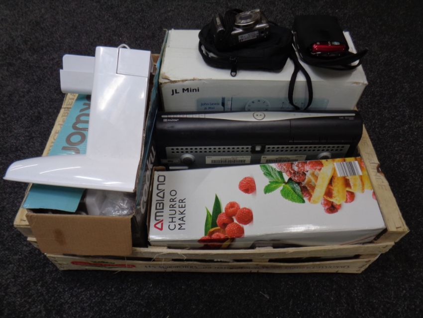 A box containing assorted electricals to include Sky HD box, digital cameras, John Lewis XL mini sewing machine