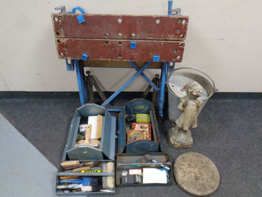 A folding Workmate together with two concertina toolboxes containing a small quantity of tools and paint brushes, a galvanized sterilising bucket with lid, a garden statue of a girl and a further garden plaque