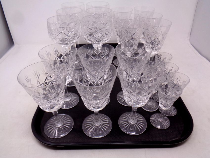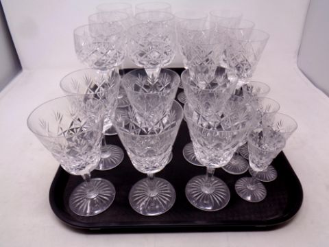 A tray containing Stewart Crystal Westbury drinking glasses to include liqueur and wine glasses