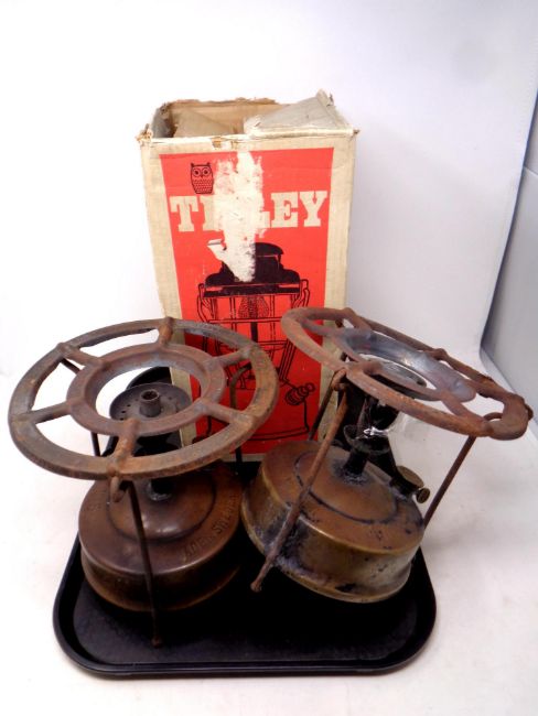 A vintage Tilley storm light, boxed, together with two Swedish Optimus stoves