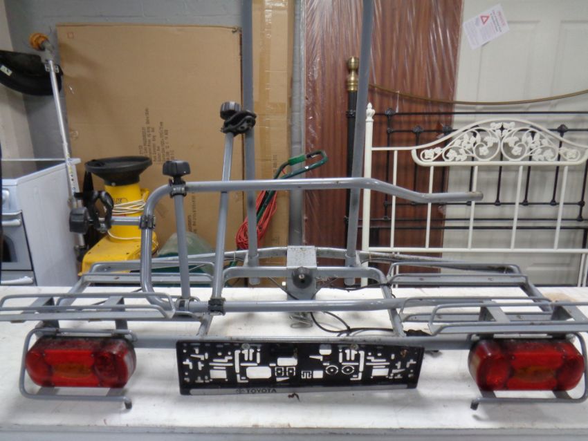 A vehicle mounted bike rack with number plate holder and lights