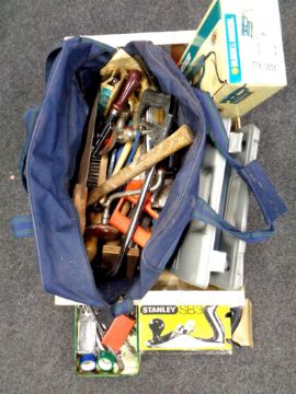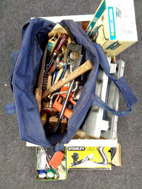 A crate containing holdall containing assorted hand tools, Stanley SB3 plane, Black and Decker electric sander