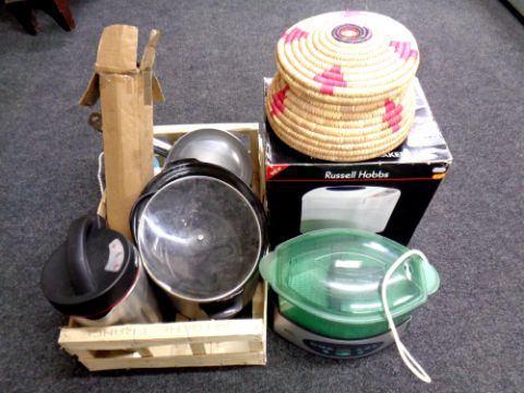 A crate containing assorted kitchen electricals to include slow cooker, soup maker, together with a wicker basket and a Russell Hobbs bread maker