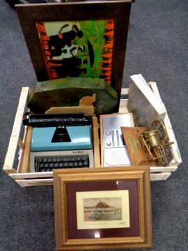 A box containing a brass locomotive on stand, DAB radio, cased cutlery, Lilliput typewriter