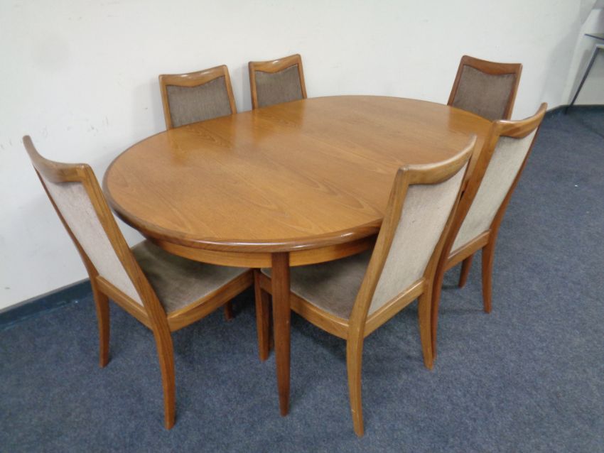 A mid 20th century teak G Plan oval extending dining table, length 163 cm (unextended) together with a set of six teak single dining chairs upholstered in a brown fabric