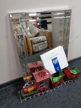 A contemporary wood framed bevel edged mirror together with a Spode Blue Room Collection plate (boxed) and a decorative metal train