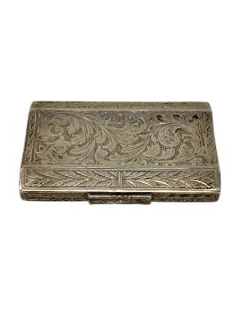 A good quality case. Condition is good. There are light surface scratches to the blue enamel but no signs of chips cracks or damages. The internal is gilt and with a four scratched initials to the base area. Base internally also stamped 8 800. Hinge is strong and without movement, the cabochon clasp has small nibbles to the tip. The engraving to the sides and base is crisp and not worn.