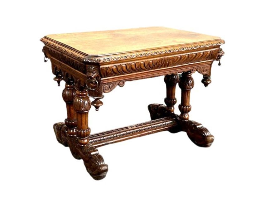 A good quality late nineteenth century oak centre table, on double pedestal supports carved with fish decoration, carved lion mask handles with gilt brass rings, width 100 cm.