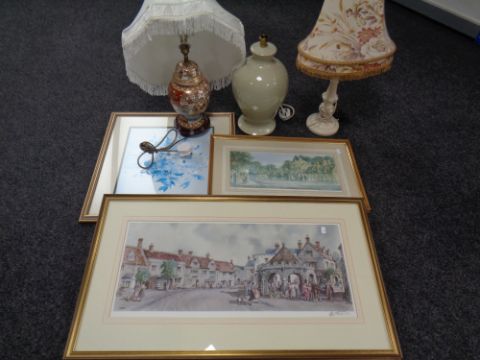 A Sturgeon signed print depicting a village market scene together with two further framed pictures and three table lamps to include Denby