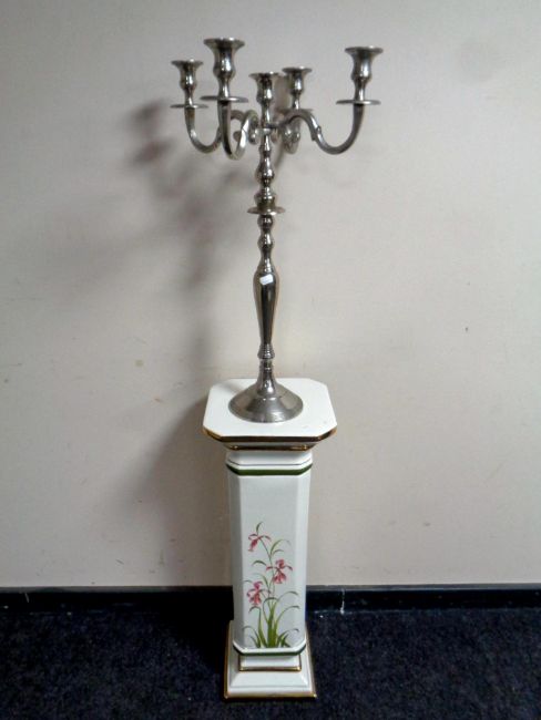 An Italian hand painted plant pedestal by Zanatto together with a metal five way table candelabrum