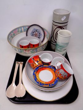 A tray of assorted ceramics to include studio pottery vases, Royal Worcester bowls and cake plate, six Andrea Fontebasso coffee cans with saucers