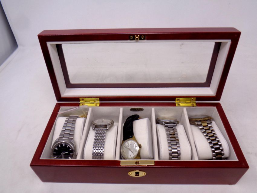 A watch box by Mele & Company containing five gent's watches, Nardin, Avia, Seiko etc