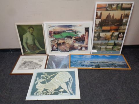 Seven framed pictures including photographs, Oxford montage etc
