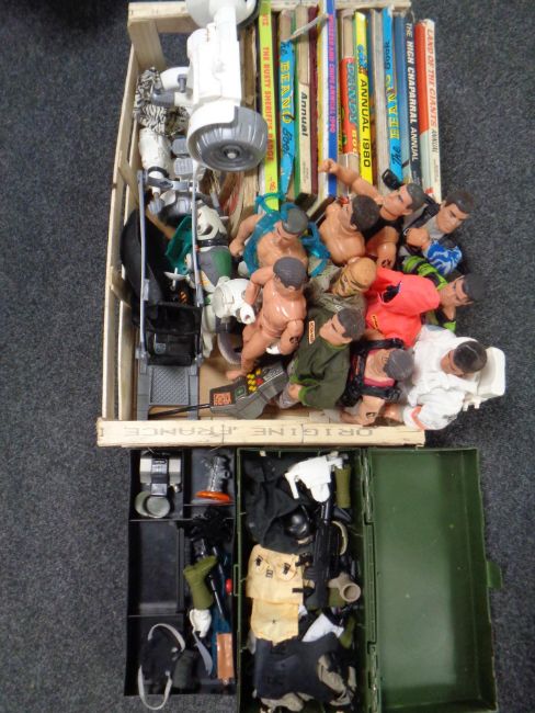 A box of twentieth century children's annuals together with eleven action man figures, chest containing guns, accessories and clothing