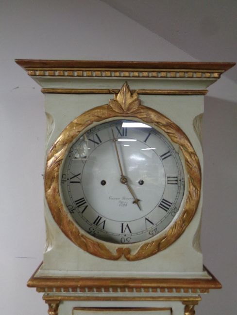 An antique Continental painted longcase clock with circular dial, pendulum and weights