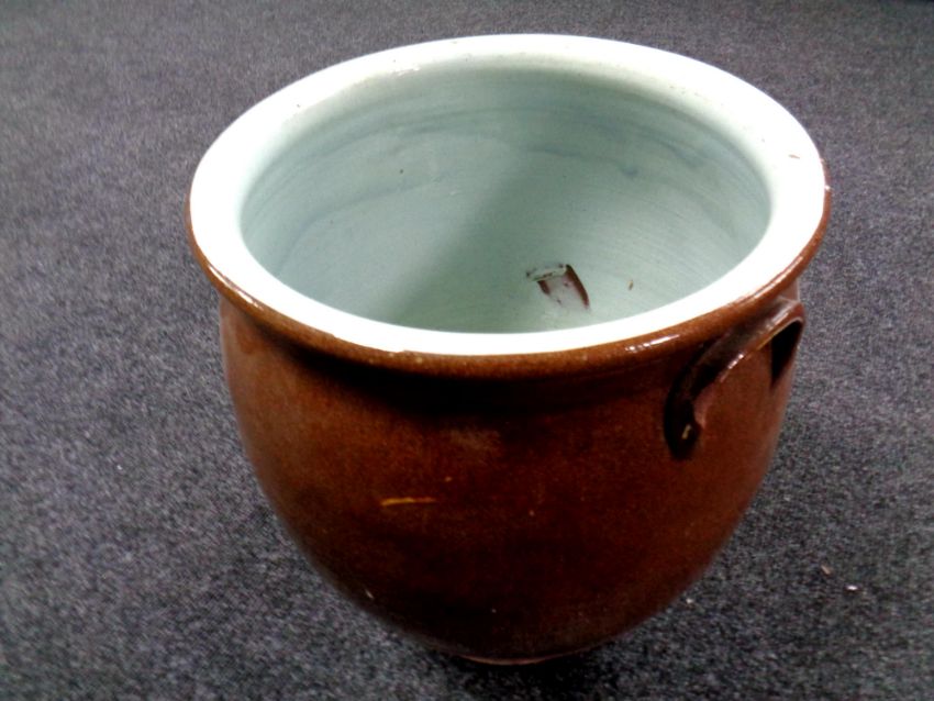 An antique glazed pottery crock pot, height 37cm (no lid)