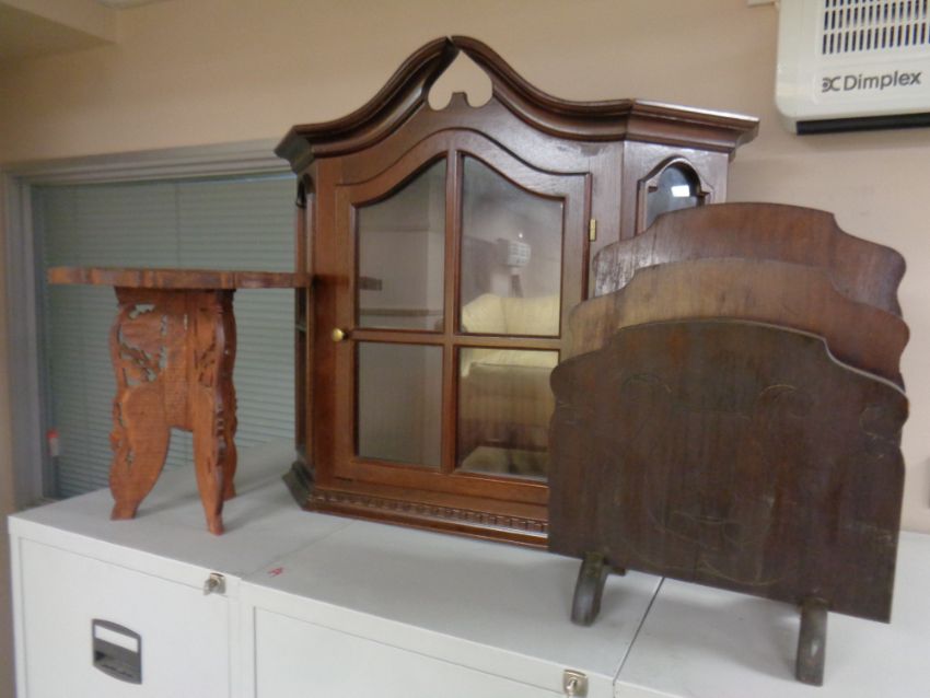 A carved hardwood wine table together with a magazine rack and wall cabinet