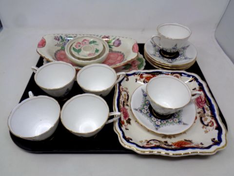 A tray of ceramics including Masons dish, Maling ware, six Stafford china cups with saucers