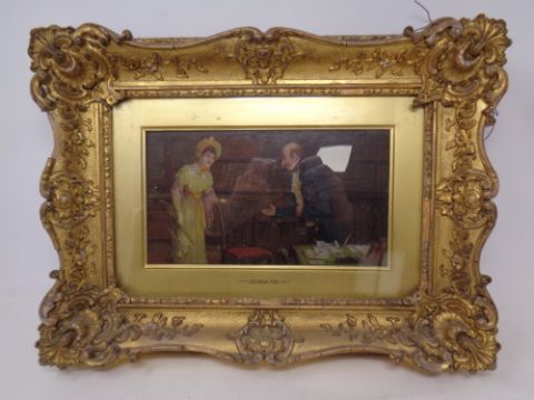 George Fox (1876-1916) Lady and gentleman in office, oil on board, 24 cm x 14 cm, in gilt composition frame.