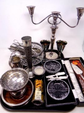 A tray of assorted plated and metal wares to include four piece table candelabra, goblets, rose bowl, wine coaster, cut glasses plated-rimmed bowl etc