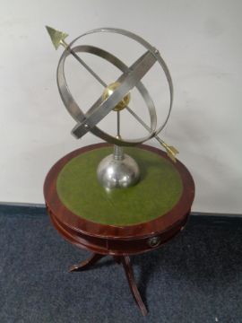An armillary sphere together with a circular pedestal drum table with green leather inset panel