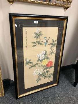 A Japanese watercolour on silk depicting birds on a branch, 72cm by 39cm
