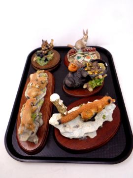 A Border Fine Arts Figure - Snowy Trail, on plinth, together with four further animal ornaments on plinths. (5)