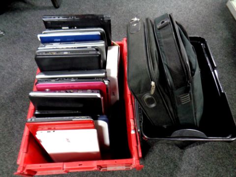 A crate containing eighteen various laptop computers, notebooks and tablets by Acer, Amazon, Asus, R.C.A., Dell, Tiny, Fujitsu, Siemens, Toshiba, Hewlett Packard, Toshiba, Packard Bell, together with a further crate containing various cables, two laptop bags, battery, etc. (Q)