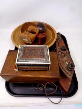 A tray of wooden pieces to include a 20th century table lamp in the form of a boat, trinket boxes, bowls etc