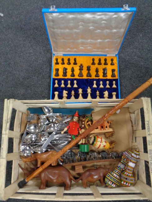 A box of wooden pieces - cased chess set, animal ornaments, walking stick, two beaded flasks, stainless steel cutlery
