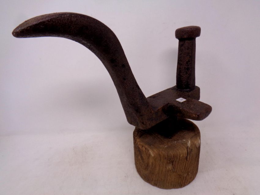 A 19th century cast iron cobbler's last on wooden stand