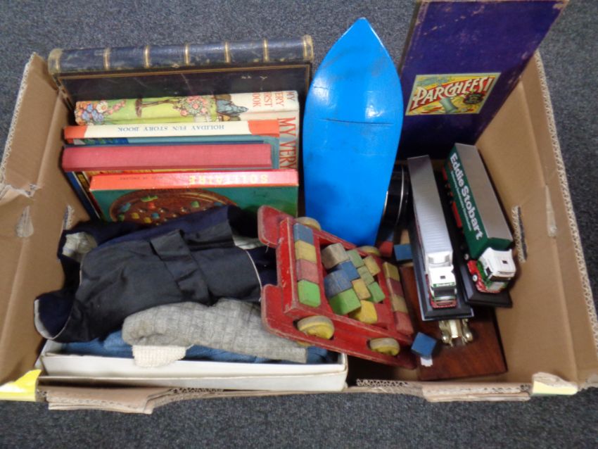A box of mid 20th century toys, children's clothing, annuals, Eddie Stobart trucks