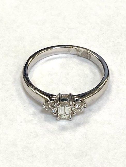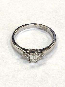 An 18ct white gold three stone diamond ring, set with a central emerald cut stone, size M/N.